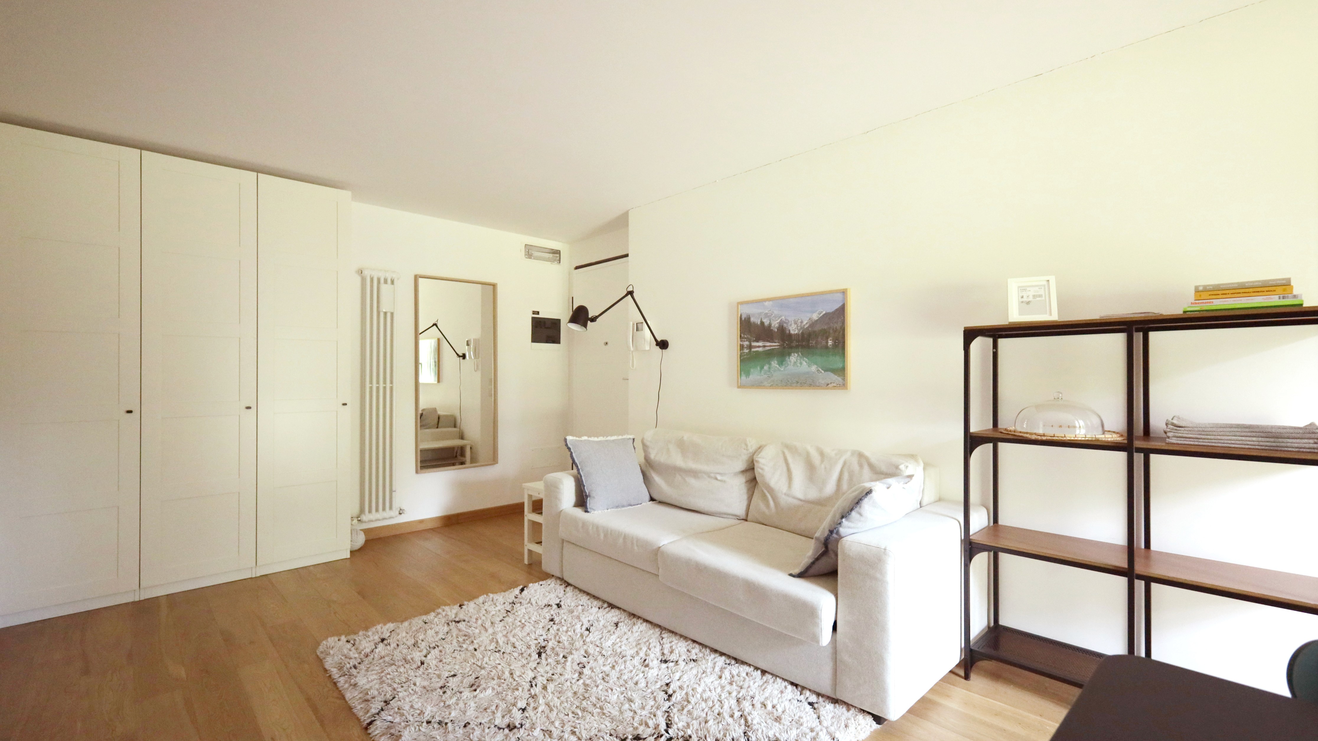 A spacious living room featuring large windows and modern decor, providing a bright and comfortable space for relaxation.