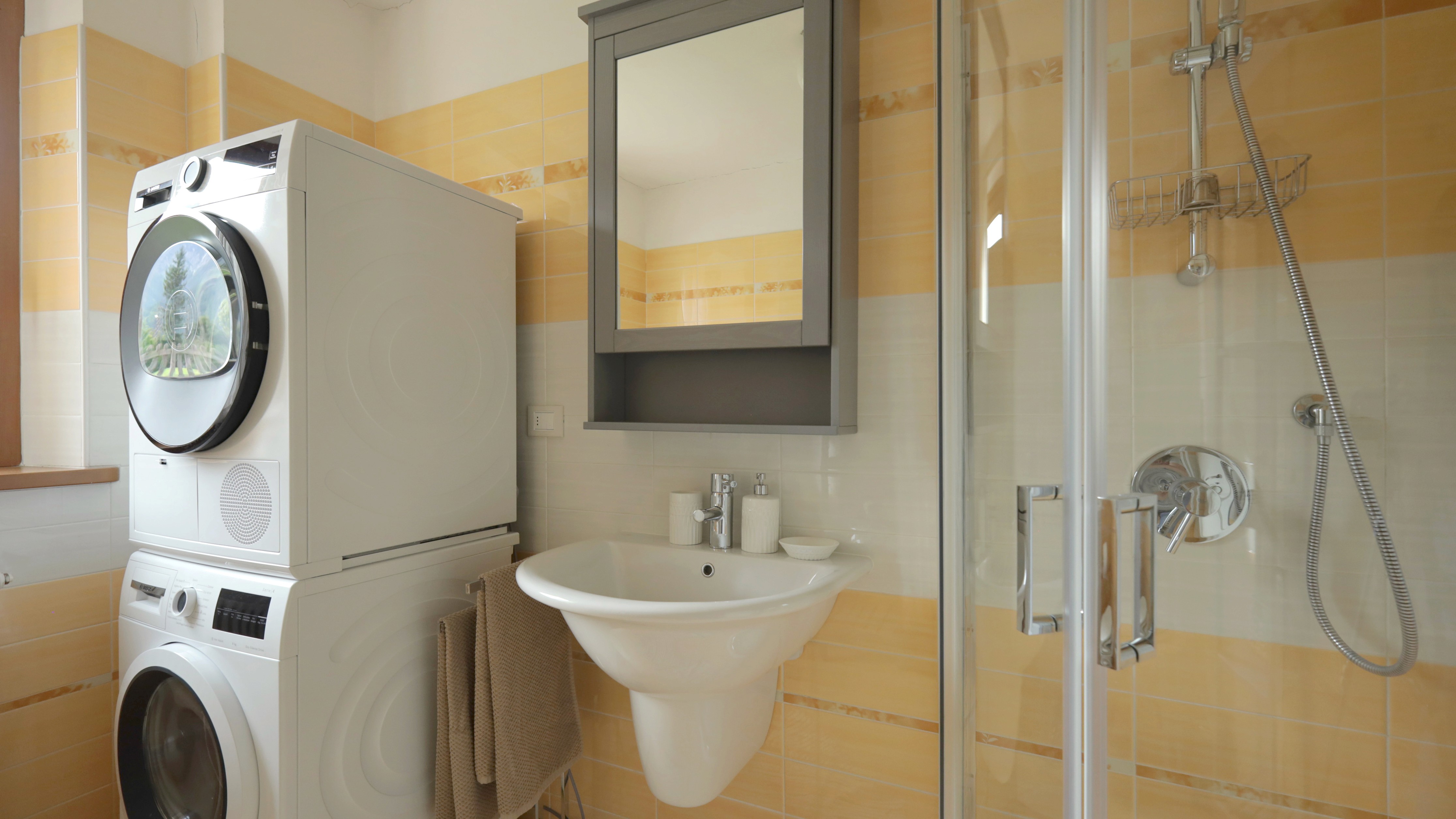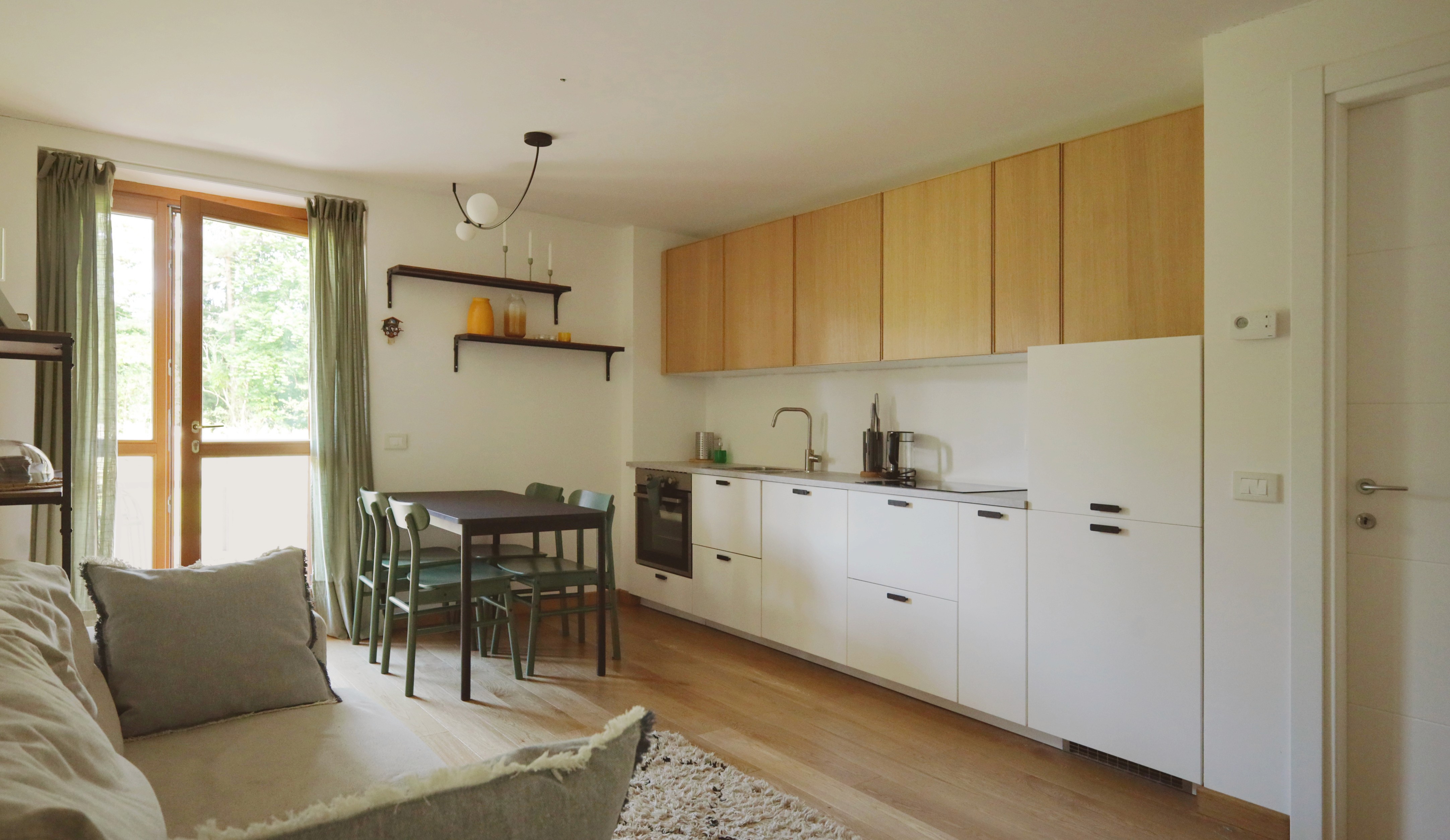 Our modern kitchen is fully equipped with everything you need to cook a great meal. It has sleek white cabinets, plenty of storage, and a dining table for four. Because it connects directly to the living room, you can cook and chat with your friends at the same time