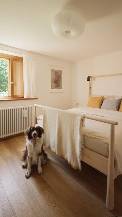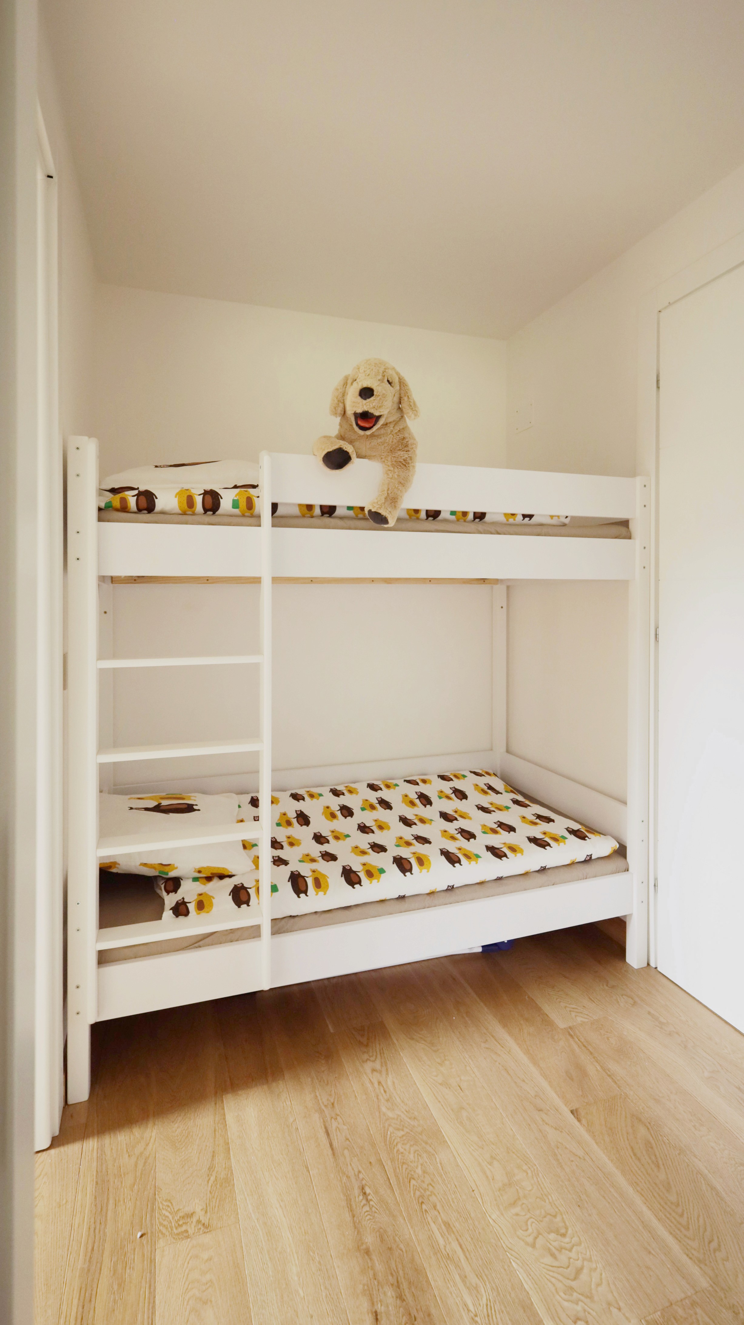 A cozy space with wooden bunk beds. It’s a quiet and comfortable spot for children to sleep